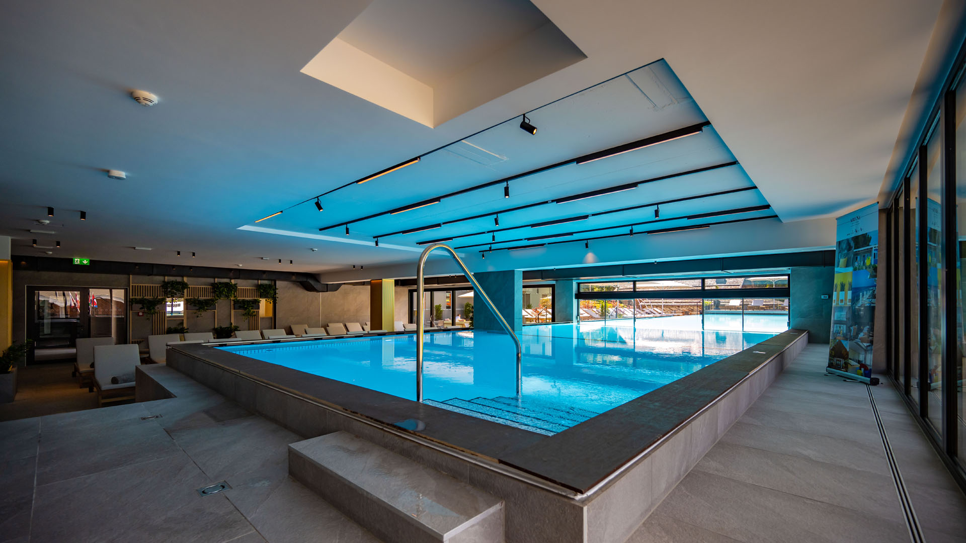 Entspannen und erholen Sie sich im luxuriösen Innenpool, der im Rahmen des neuen 900 Quadratmeter großen Innen- und Außenbereichs komplett renoviert wurde.